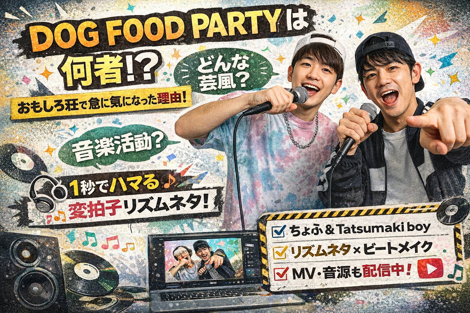 じゃあ制作スタイルは?というと、Tatsumaki boyの自己紹介で「ビートメイクとラップ担当」と書かれていることから、少なくとも音の核はTatsumaki boy側が握ってる可能性が高い。ちょふは趣味・特技的にパフォーマンスや即興が得意そうなので、そこがネタの表側(歌い方・動き・キャラ)を厚くしてるイメージ。つまり、DOG FOOD PARTYの音楽活動は「作る人がいて」「表現する人がいて」成立してるっぽい。コンビとしてめちゃくちゃ相性がいいやつだよ。